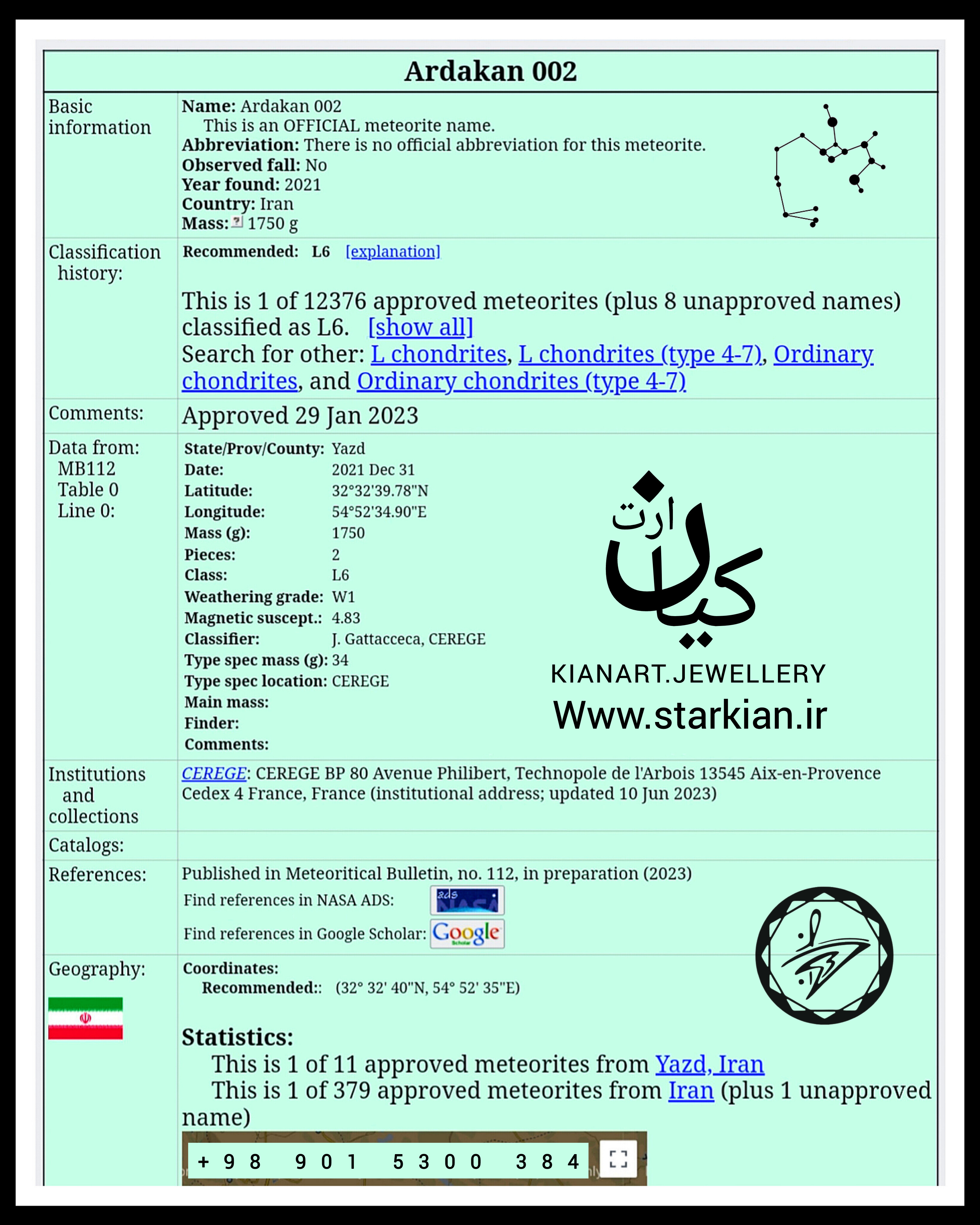 ثبت شده در بولتن جهانی شهابسنگ ها (ARDAKAN-002)